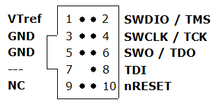 | 10 | nRESET | I/O | Target CPU reset signal. Typically connected to the RESET pin of the target CPU, which is typically called "nRST", "nRESET" or "RESET". This signal is an active low signal. |