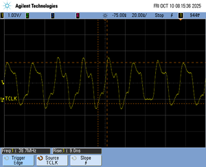 The following pictures show oscilloscope measurements of trace signals output by the "Tested Hardware" using the example project. All measurements have been performed using a Agilent InfiniiVision DSO7034B 350 MHz 2GSa/s oscilloscope and 1156A 1.5 GHz Active Probes. If your trace signals look similar on your trace hardware, chances are good that tracing will work out-of-the-box using the example project. More information about correct trace timing can be found at the following website.