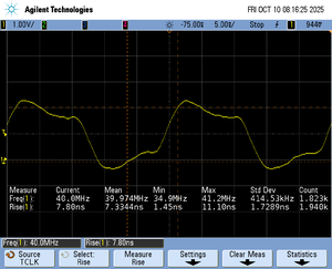 The rise time of a signal shows the time needed for a signal to rise from logical 0 to logical 1. For this the values at 10% and 90% of the expected voltage level get used as markers. The following picture shows such a measurement for the trace clock signal.