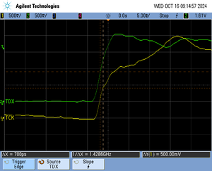 The following pictures show oscilloscope measurements of trace signals output by the "Tested Hardware" using the example project. All measurements have been performed using a Agilent InfiniiVision DSO7034B 350 MHz 2GSa/s oscilloscope and 1156A 1.5 GHz Active Probes. If your trace signals look similar on your trace hardware, chances are good that tracing will work out-of-the-box using the example project. More information about correct trace timing can be found at the following website.