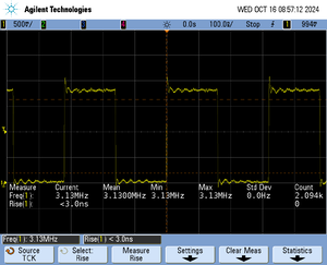 The rise time of a signal shows the time needed for a signal to rise from logical 0 to logical 1. For this the values at 10% and 90% of the expected voltage level get used as markers. The following picture shows such a measurement for the trace clock signal.