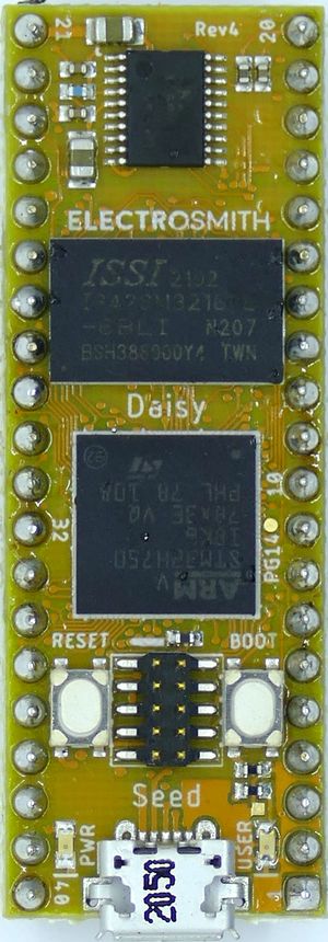 This article describes specifics for the Electrosmith Daisy Seed evaluation board. The board contains the ST STM32H750IBK6 chip and has an ISSI IS25LP064 64 MBit SPI flash.