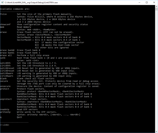 J-Link STR91x Commander (JLinkSTR91x.exe) is a command line based utility that can be used configure STR91x cores. The J-Link STR91x Commander is part of the J-Link Software and Documentation Pack, which is available for download on the SEGGER webpage.