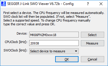 Similar to the GUI Version, J-Link SWO Viewer CL asks for a device name or CPU clock speed at startup to be able