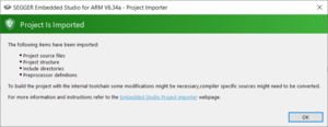 While imported projects will usually re-build with the external tool chain out-of-the-box, for the internal SEGGER tool chain based project build configurations, some manual changes may be required.