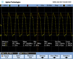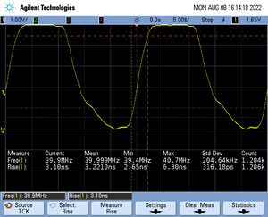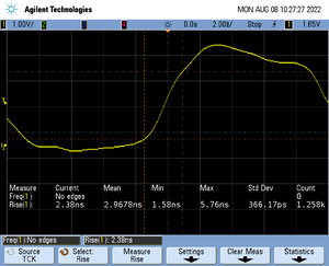 The rise time of a signal shows the time needed for a signal to rise from logical 0 to logical 1. For this the values at 10% and 90% of the expected voltage level get used as markers. The following picture shows such a measurement for the trace clock signal.