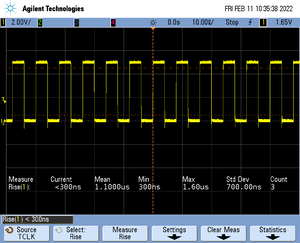 The rise time of a signal shows the time needed for a signal to rise from logical 0 to logical 1. For this the values at 10% and 90% of the expected voltage level get used as markers. The following picture shows such a measurement for the trace clock signal.