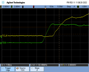 The following pictures show oscilloscope measurements of trace signals output by the "Tested Hardware" using the example project. All measurements have been performed using a Agilent InfiniiVision DSO7034B 350 MHz 2GSa/s oscilloscope and 1156A 1.5 GHz Active Probes. If your trace signals look similar on your trace hardware, chances are good that tracing will work out-of-the-box using the example project. More information about correct trace timing can be found at the following website.