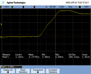 The rise time of a signal shows the time needed for a signal to rise from logical 0 to logical 1. For this the values at 10% and 90% of the expected voltage level get used as markers. The following picture shows such a measurement for the trace clock signal.